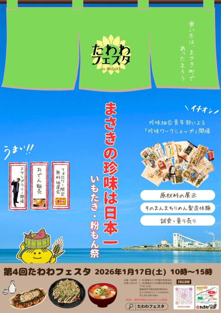 第4回たわわフェスタが、2026年1月17日(土) 10:00〜15:00、まさき村前駐車場(エミフルMASAKI)で開催されます!
